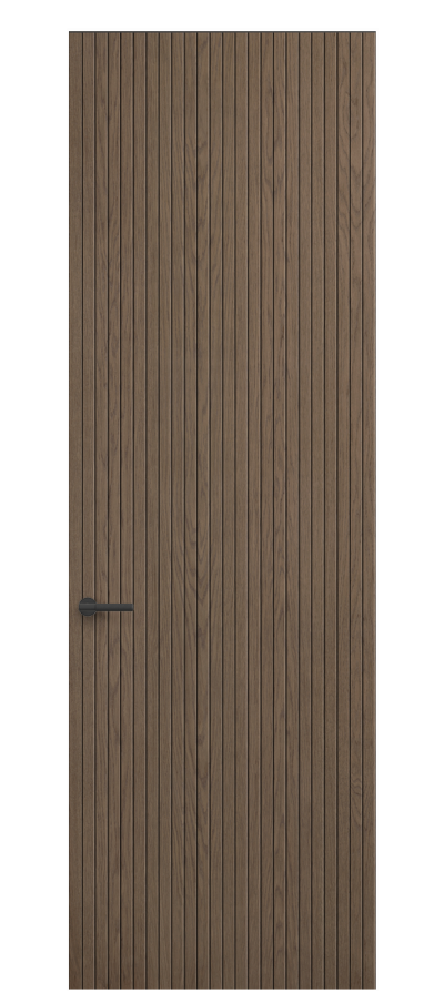SELECT — коллекция минималистичных дверей с фрезеровкой по натуральному шпону. Рельеф на поверхности полотна создаёт игру света и тени, добавляя пространству динамичности и визуального объёма. Двери SELECT в сочетании со стеновыми панелями и мебельными фасадами, повторяющими лаконичный дизайн, создают единое стилевое решение.