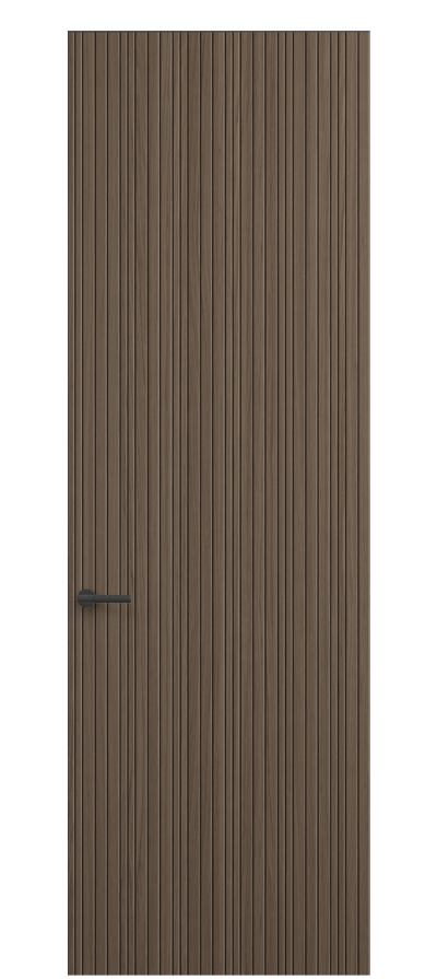 SELECT — коллекция минималистичных дверей с фрезеровкой по натуральному шпону. Рельеф на поверхности полотна создаёт игру света и тени, добавляя пространству динамичности и визуального объёма. Двери SELECT в сочетании со стеновыми панелями и мебельными фасадами, повторяющими лаконичный дизайн, создают единое стилевое решение.